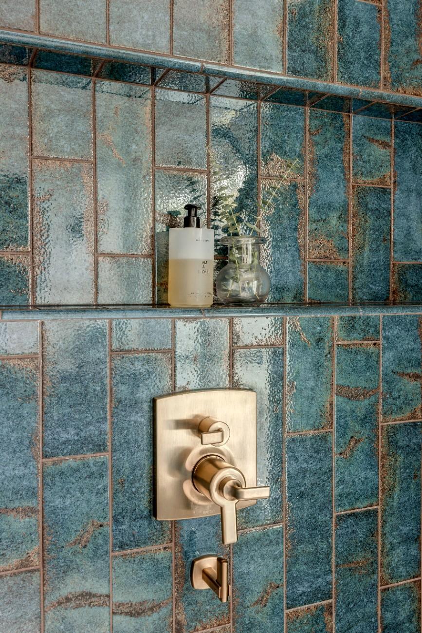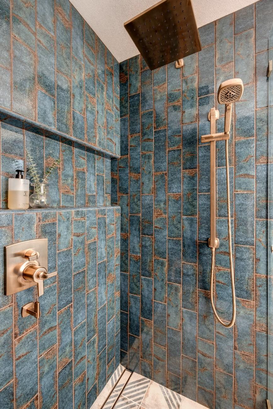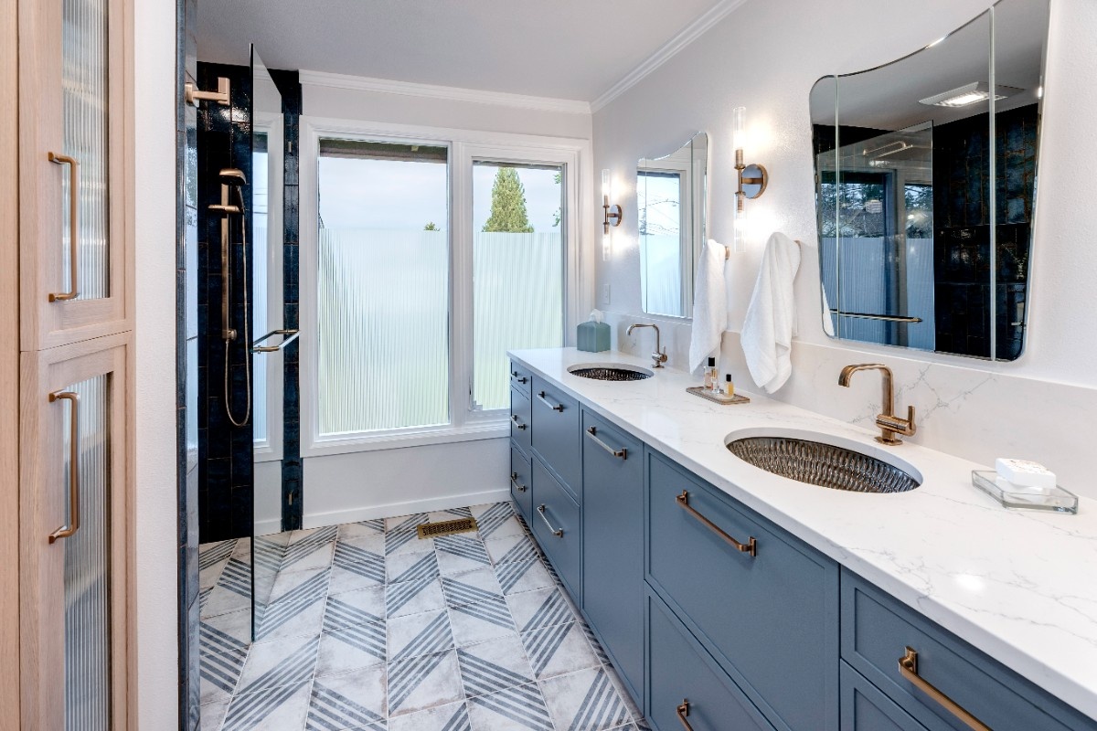 This inviting bathroom combines smart functionality with refined style. The custom sage-green cabinetry adds a warm, earthy tone, beautifully contrasted by bright white countertops and polished nickel hardware. Dual sinks and generous storage make the space as practical as it is attractive, while the natural light from the overhead skylight creates an open, airy feel. In the shower, a mix of soft green and classic white subway tile brings depth and texture, complemented by thoughtful features like built-in shelving and modern fixtures. A patterned hex tile floor framed in gray adds a touch ofcharacter, rounding out a space that feels both serene and effortlessly sophisticated.