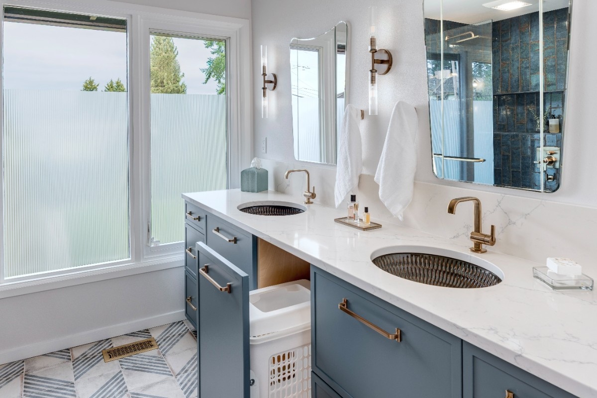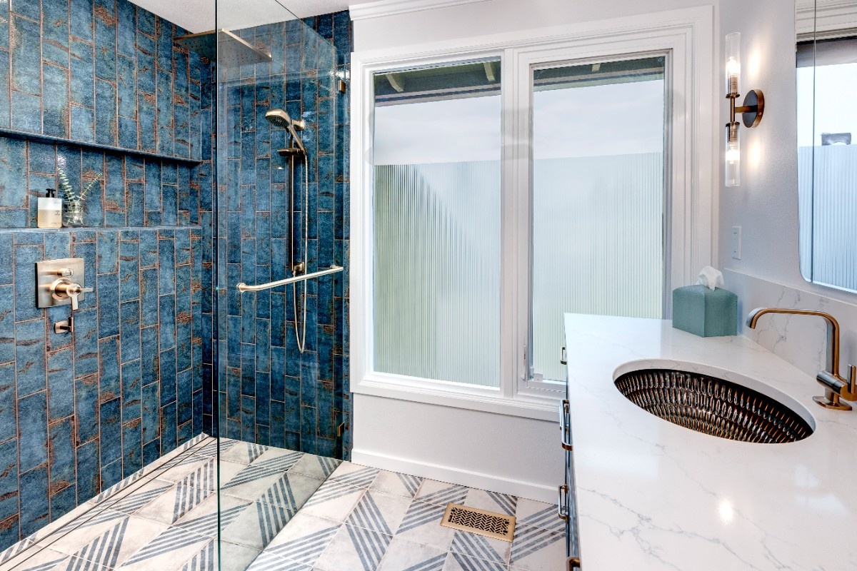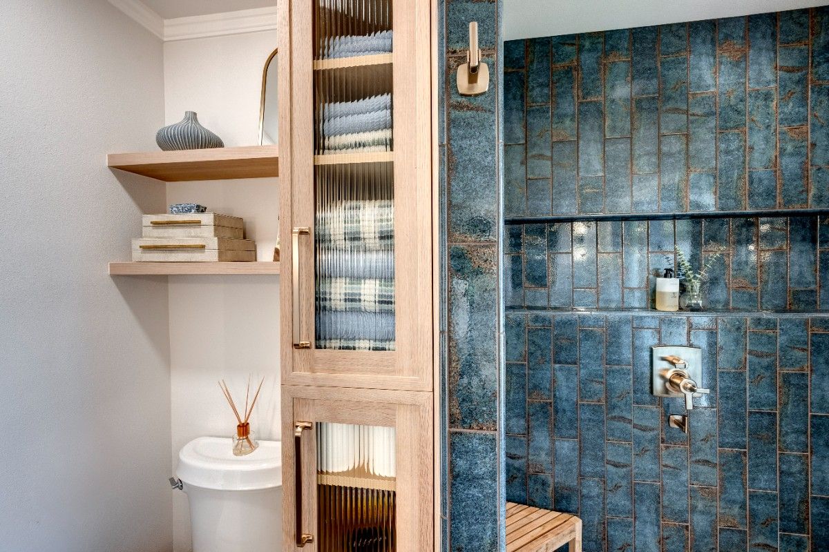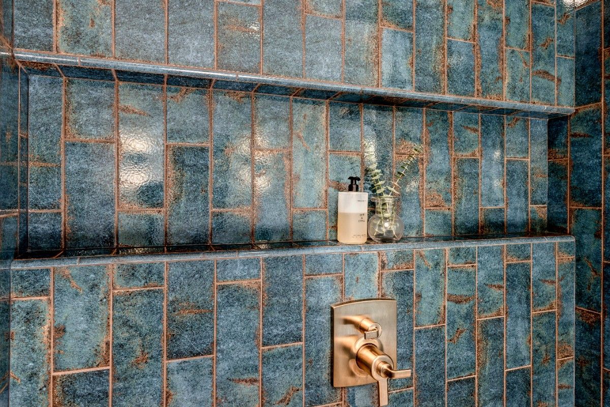 This inviting bathroom combines smart functionality with refined style. The custom sage-green cabinetry adds a warm, earthy tone, beautifully contrasted by bright white countertops and polished nickel hardware. Dual sinks and generous storage make the space as practical as it is attractive, while the natural light from the overhead skylight creates an open, airy feel. In the shower, a mix of soft green and classic white subway tile brings depth and texture, complemented by thoughtful features like built-in shelving and modern fixtures. A patterned hex tile floor framed in gray adds a touch ofcharacter, rounding out a space that feels both serene and effortlessly sophisticated.