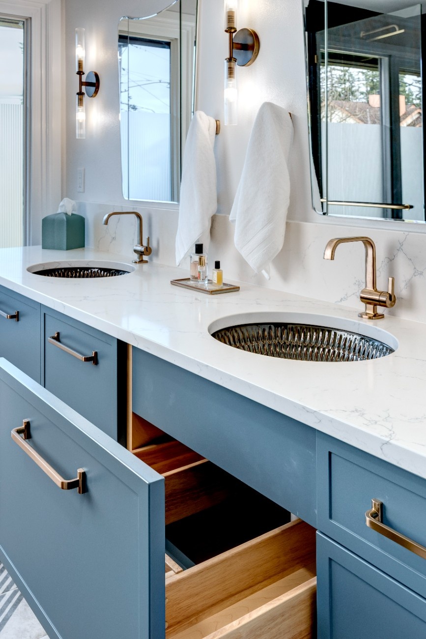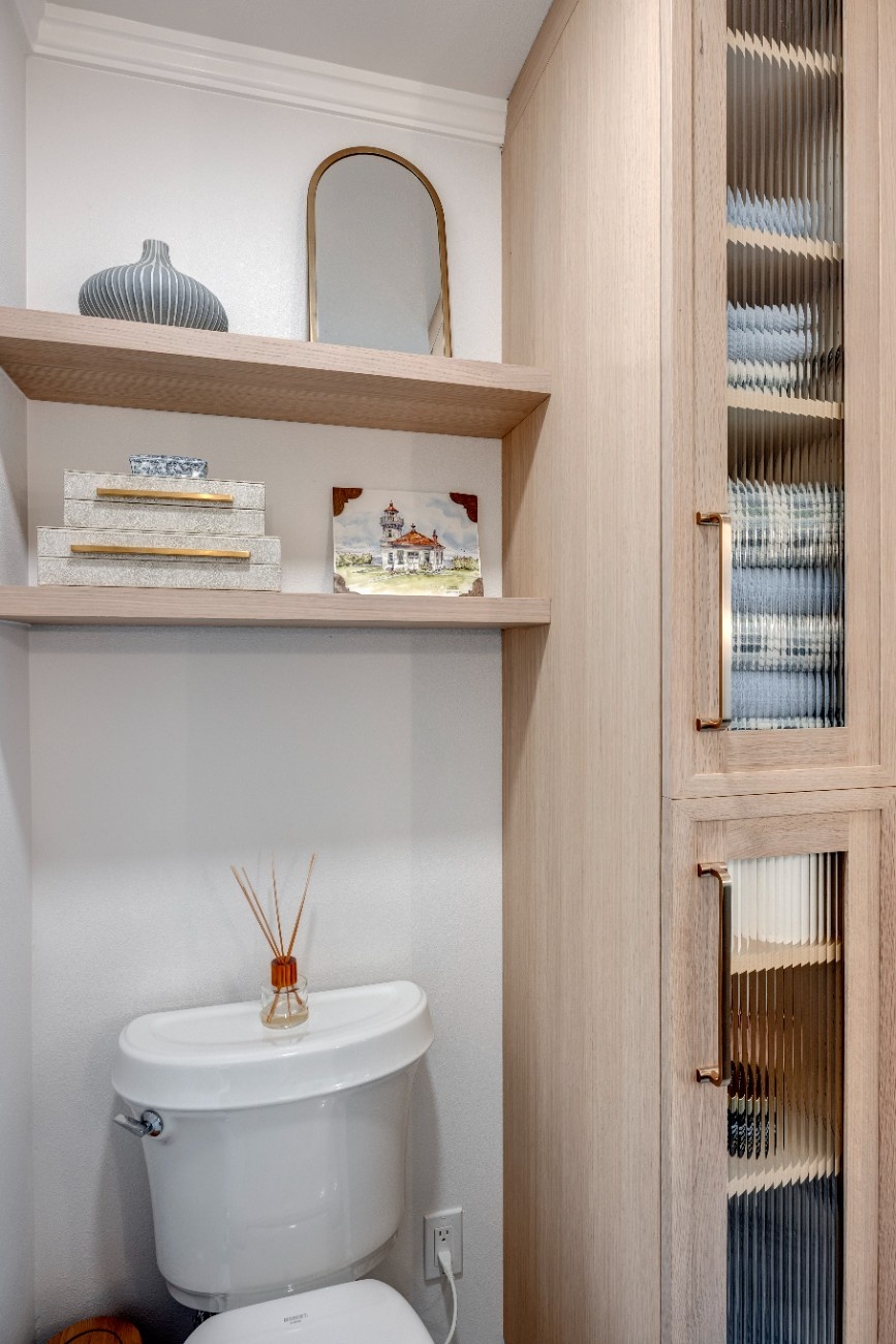 This award-winning master bathroom design focused on creating more storage in a small space while making it look and feel like an exquisite spa. The vanity with tall storage on either side and wall mounted faucets allows for extra storage, and luxury shower fixtures including hand shower, rain shower, and fixed shower turn the small space into a personal spa.