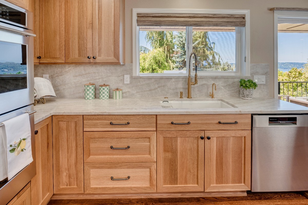 This kitchen offers a seamless blend of organic charm and modern refinement. Natural wood cabinetry brings warmth and texture, beautifully contrasted by sleek black hardware and clean, white quartz countertops. The slate tile flooring adds a grounding element, while the soft gray-blue island introduces a subtle pop of color and additional workspace, complete with bar seating for casual gatherings. Expansive corner windows flood the room with natural light, enhancing the airy feel and connecting the space to the outdoors. A glass mosaic backsplash and stainless steel appliances complete the look, making this kitchen as visually striking as it is highly functional.